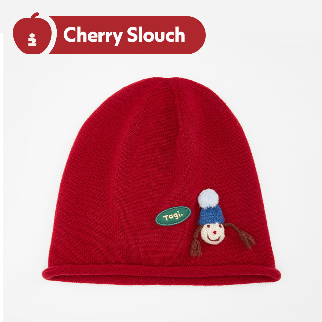 Tagi. Dress-up Game Knit Slouch Beanie Color: Sesame Slouch, Blueberry Slouch, Cherry Slouch Material (Yarn Composition): Sesame Slouch: 48% Acrylic, 40% Nylon, 12% Wool (excluding decorations) Blueberry Slouch: 50% Acrylic,...